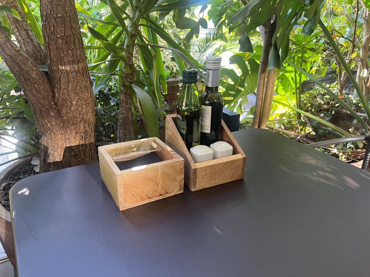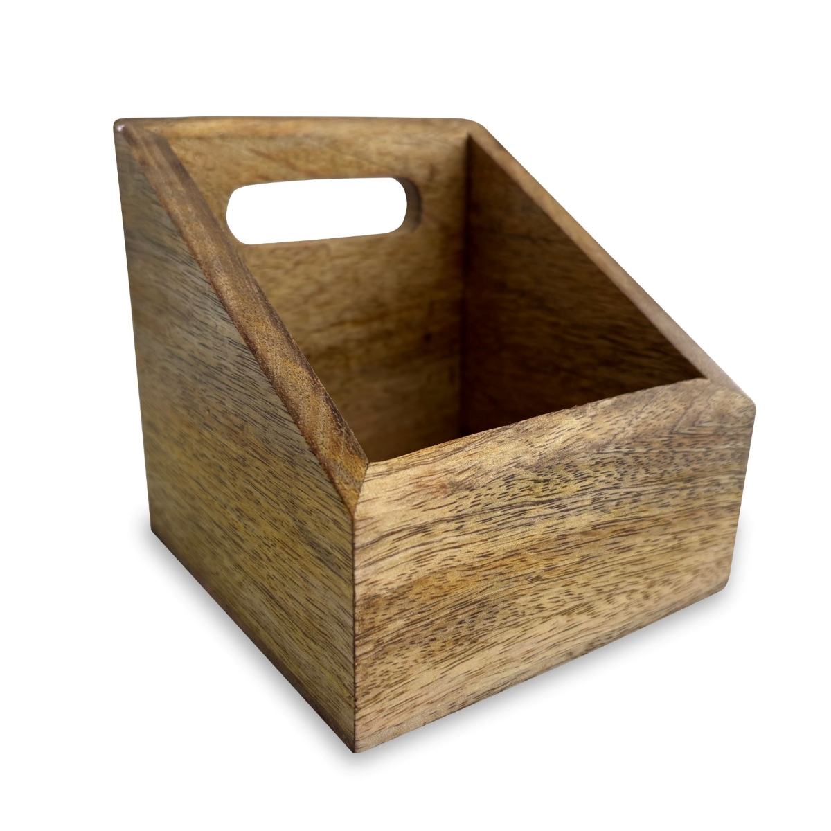 Cubeta con asa trasera para almacenar y transportar artículos de mesa: saleros, aceitera, vinagre... fabricada en madera, mide 13x13cm y de altura mide 6cm en la parte delantera y 12cm en la trasera. Ideal para combinarlo con el servilletero anti-viento ref.17-3002.