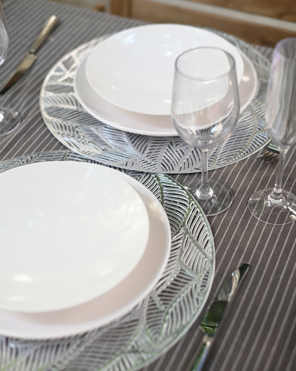 Mantel individual Palmeras, redondo con diámetro 38cm, calado, fabricado en PVC. Una bonita forma de decorar la mesa, con un toque original y diferente.Disponible en dos colores.