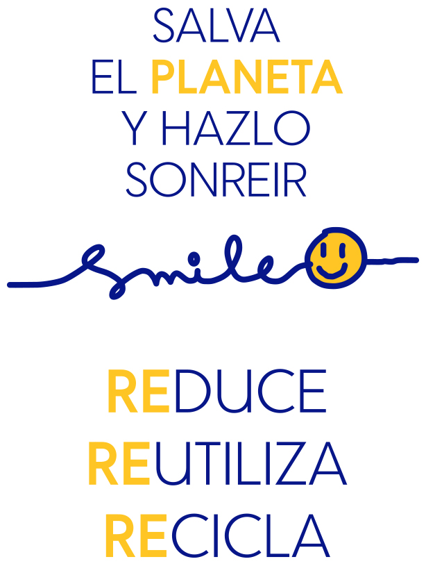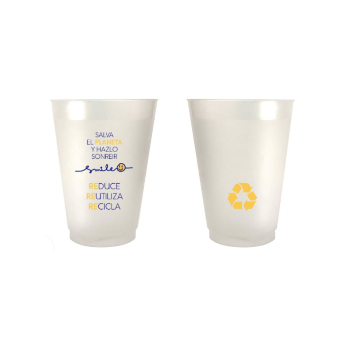 Vaso de color blanco translúcido, incluye un slogan a favor del reciclaje "Salva el Planet y hazlo sonreír: Reduce, Reutiliza, Recicla!".